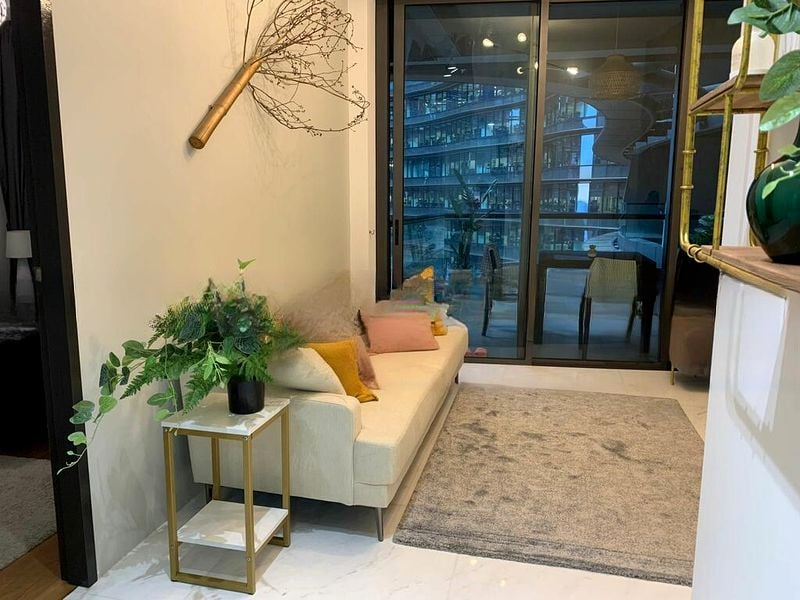 Step into a world of modern luxury as you enter this exquisite unit at Marina Bay Residences. The abundant natural light floods through the floor-to-ceiling windows, showcasing panoramic views of the Marina Bay, city skyline, and iconic landmarks like the ArtScience Museum and Singapore Flyer. The polished marble flooring and designer finishes create an ambiance that is both elegant and inviting.