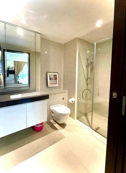 This well-maintained home boasts standout features such as a luxurious rain shower and a large mirrored vanity cabinet in the bathroom, enhancing the contemporary feel. The bedroom, with its dark wood flooring and built-in lighting, offers a tranquil retreat, while the dual-layer curtains provide both privacy and style.