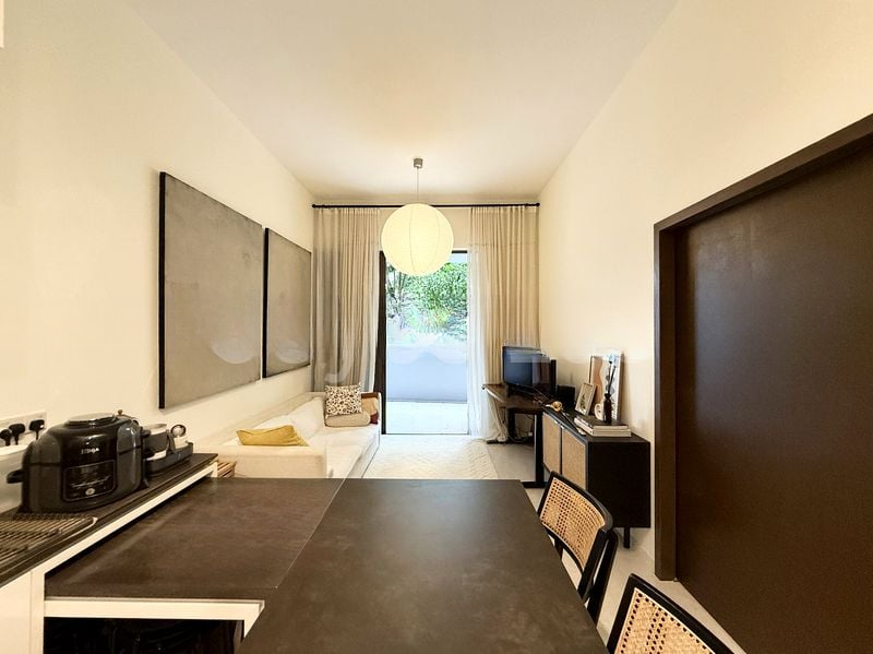Step into a world of modern elegance with abundant natural light flooding through the floor-to-ceiling windows of this beautifully renovated 1-bedroom unit. The open-concept living area, adorned with light-colored floor tiles and minimalist furniture, creates an inviting ambiance that seamlessly connects to the sleek kitchen, featuring black stone countertops and integrated dining space.