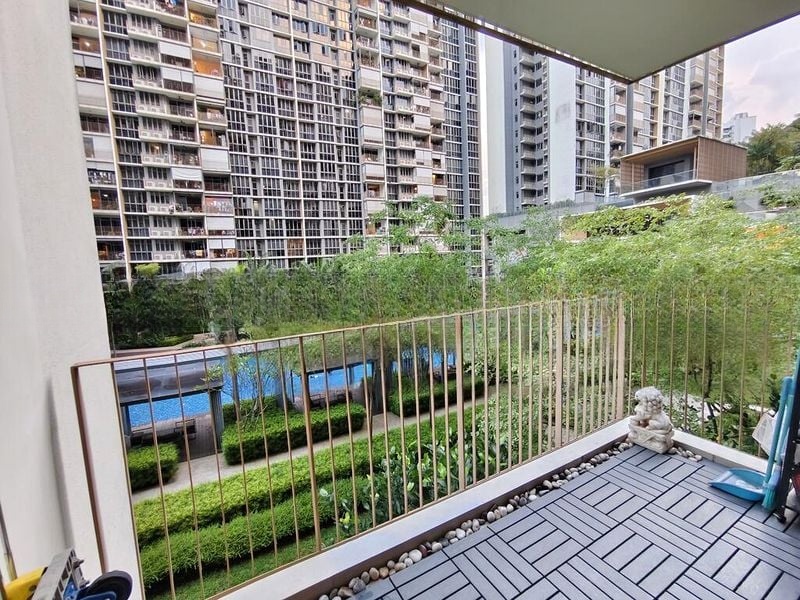 Step into a world of warmth and elegance as you enter this beautifully renovated unit at Sol Acres. The abundant natural light floods the space, highlighting the ornate furniture and cozy ambiance. Sliding glass doors lead you to a large balcony adorned with wooden-look floor tiles, where you can unwind amidst lush greenery and enjoy the decorative hanging lamp that adds a touch of charm.