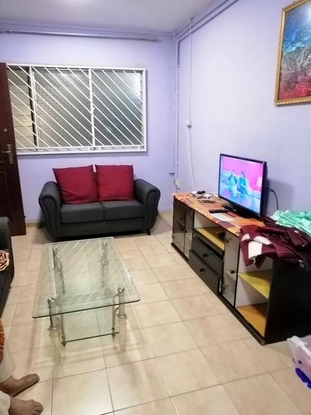 Step into this well-maintained HDB flat and be greeted by a bright and functional living space that exudes warmth and comfort. The open-concept layout seamlessly connects the living and dining areas, enhanced by sliding glass doors that invite natural light. The leather sofa and modern ceiling fan create a cozy ambiance, while the tiled flooring adds a touch of elegance.