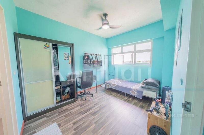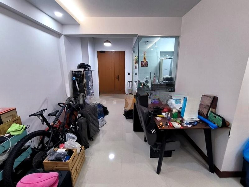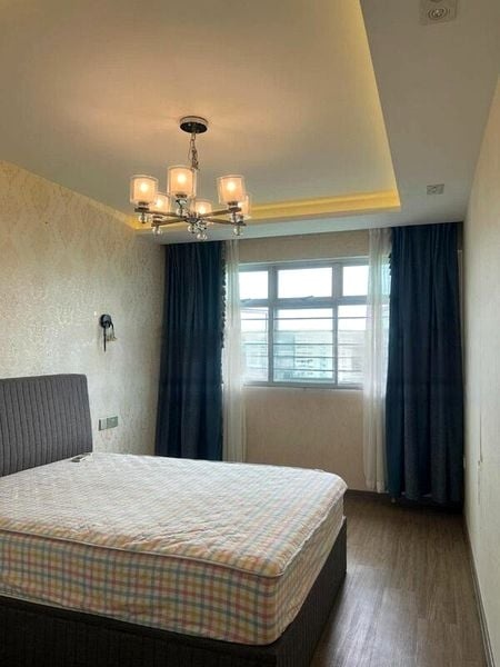 Step into this beautifully renovated HDB flat and be greeted by a warm ambiance that combines modern design with cozy living. The polished tile flooring and cove lighting in the living room create an inviting atmosphere, while large windows offer a glimpse of the urban landscape beyond. The marble-patterned TV feature wall and stylish chandeliers add a touch of elegance, making this space perfect for relaxation or entertaining.