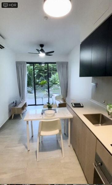 Step into a serene oasis at Grandeur Park Residences, where modern minimalist design meets nature. The open-concept living area welcomes you with abundant natural light filtering through large windows, illuminating the tan leather-look sofa and seamlessly connecting to a private balcony adorned with lush greenery views. The ambiance is both calming and sophisticated, perfect for unwinding after a long day.