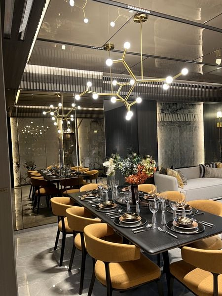 Step into a world of modern luxury as you enter this brand-new designer unit at The Myst. Bathed in natural light, the open-concept living area features a stunning marble-look TV wall and designer furnishings that create an inviting ambiance. Floor-to-ceiling windows frame picturesque greenery views, while the recessed lighting and textured rug add warmth and sophistication.