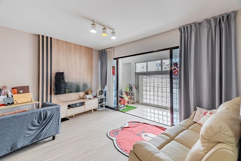 Step into this spacious 4-bedroom HDB flat and feel the warmth of a lived-in home. The moderate natural light filters through the windows, highlighting the functional tiled flooring and the charm of the original finishes. The inviting ambiance is enhanced by the thoughtful layout, featuring a cozy wooden bunk bed in one room and a large master bedroom with a full-height sliding door wardrobe.