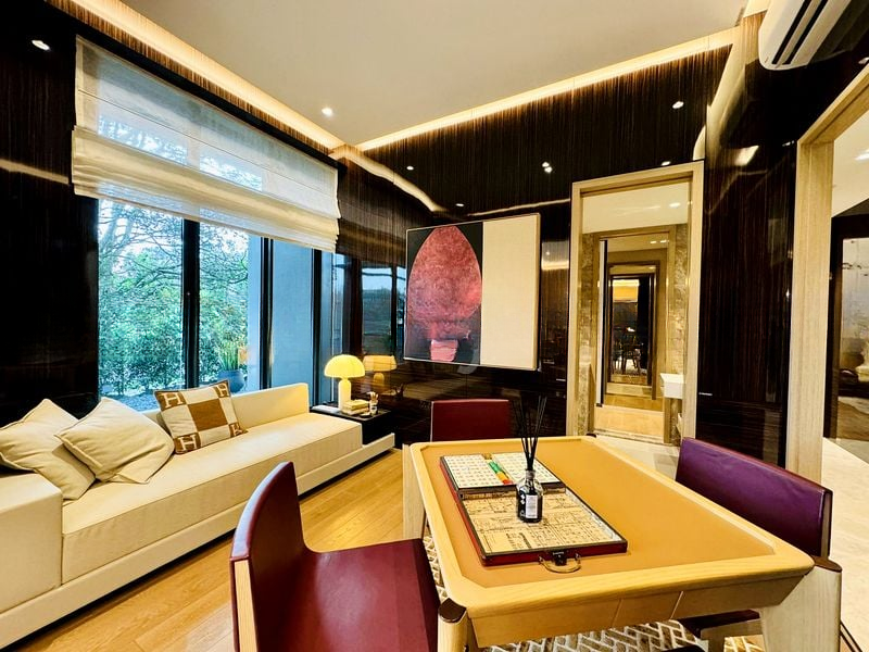 This exquisite 5-bedroom, 6-bathroom unit boasts standout features including a spacious island kitchen with white marble countertops, minimalist cabinetry, and integrated appliances. The master bedroom is a sanctuary of comfort, featuring cherry blossom motif wallpaper and large windows that frame the lush greenery outside. Each room is thoughtfully designed with high-end finishes, from the designer petal chandelier in the living area to the entertainment room with its glossy dark wood walls and mahjong table set.