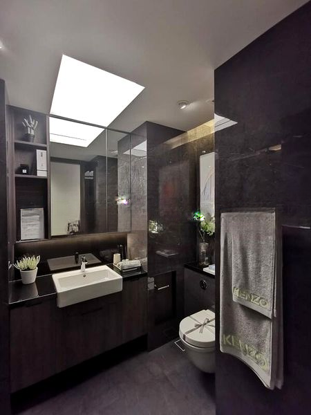 This well-appointed 2-bedroom unit features an open-concept kitchen with sleek frosted glass upper cabinets and dark lower cabinetry, seamlessly flowing into the spacious living area. The bathroom is a true highlight, showcasing dark stone wall tiles and a stunning backlit ceiling panel that enhances the designer vanity area. Each room is thoughtfully designed, with track lighting and built-in features that elevate the living experience.