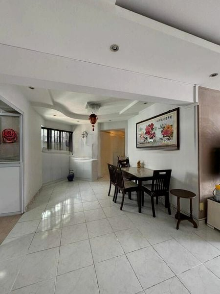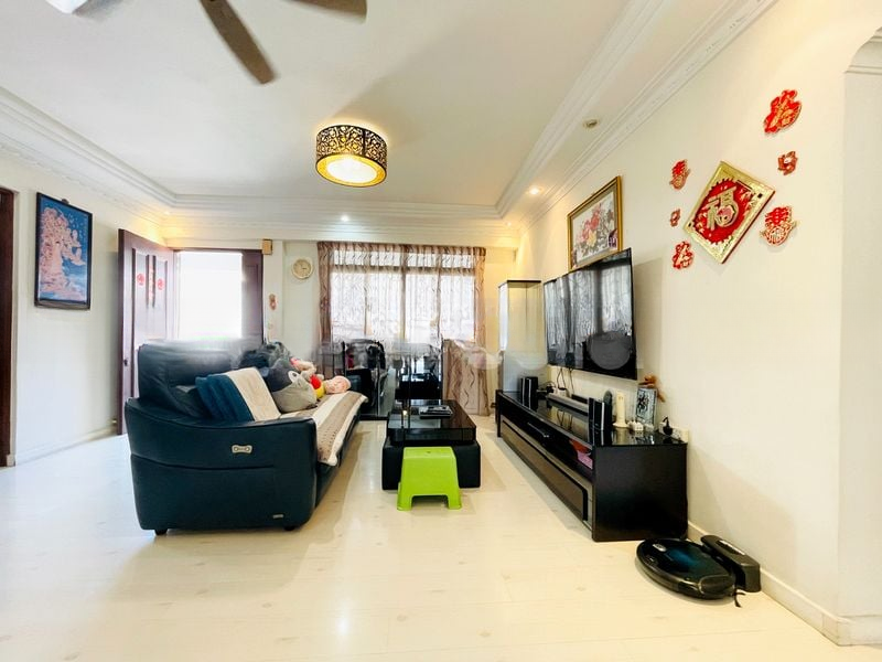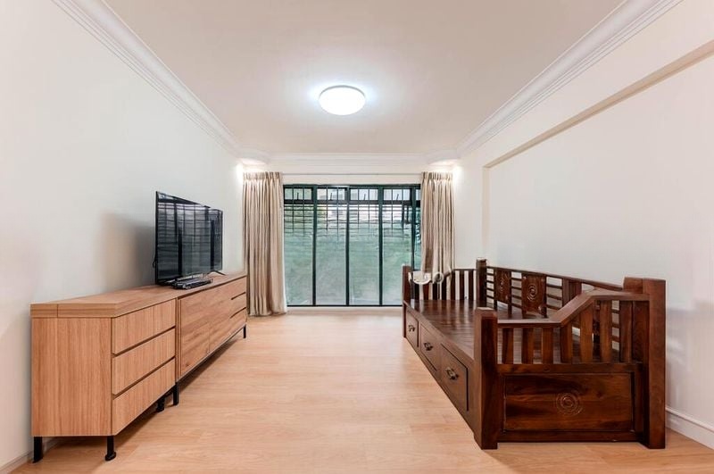 Step into this bright and airy HDB flat, where natural light dances across the spacious living area, highlighting the elegant wood-look laminate flooring and the custom wooden daybed. The false ceiling with recessed lighting adds a modern touch, creating an inviting ambiance perfect for relaxation and entertaining.