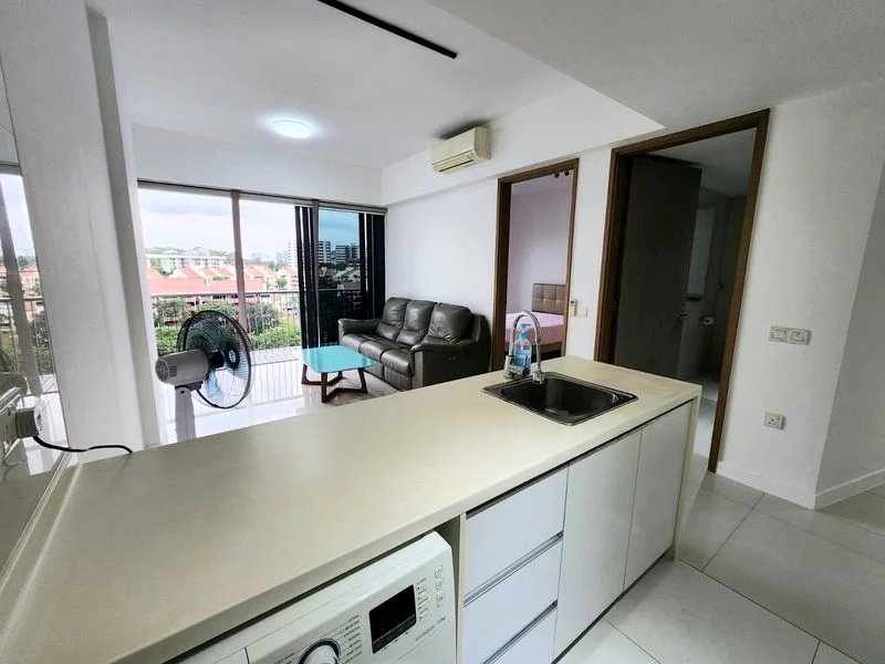 Step into a bright and airy sanctuary at D'LEEDON, where abundant natural light floods the open-concept living space through large windows, offering serene views of lush greenery and surrounding residential buildings. The modern finishes and tiled flooring create an inviting ambiance, perfect for relaxation or entertaining.