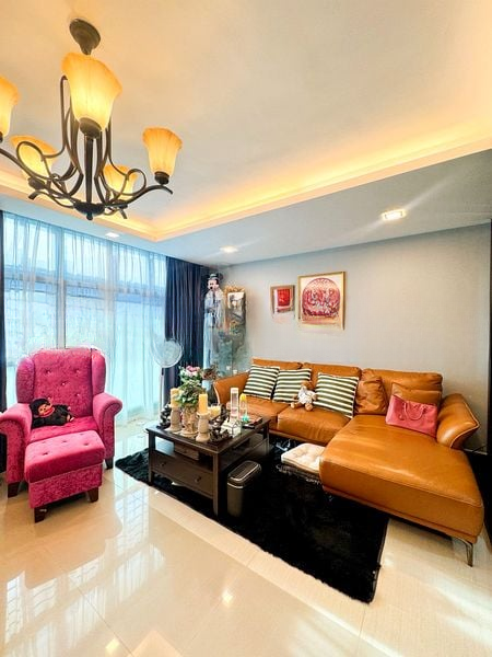 Step into this beautifully maintained 2-bedroom flat and feel the warmth of abundant natural light flooding through large windows, creating a bright and airy ambiance. The open-concept living room seamlessly integrates with the dining area, adorned with a stylish wooden dining set and a large floor-to-ceiling built-in storage unit that adds both functionality and elegance.