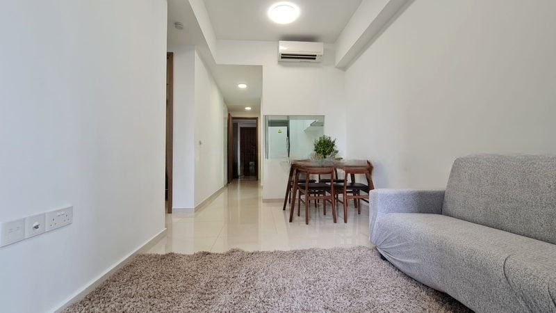 This well-maintained unit boasts a fully-furnished layout with standout features including a stylish glass kitchen partition, sleek white countertops, and an induction hob. The living room is adorned with a plush grey shag rug, while the dining area showcases a wooden dining set, perfect for entertaining. With two comfortable bedrooms and two bathrooms, this space is designed for both relaxation and functionality.