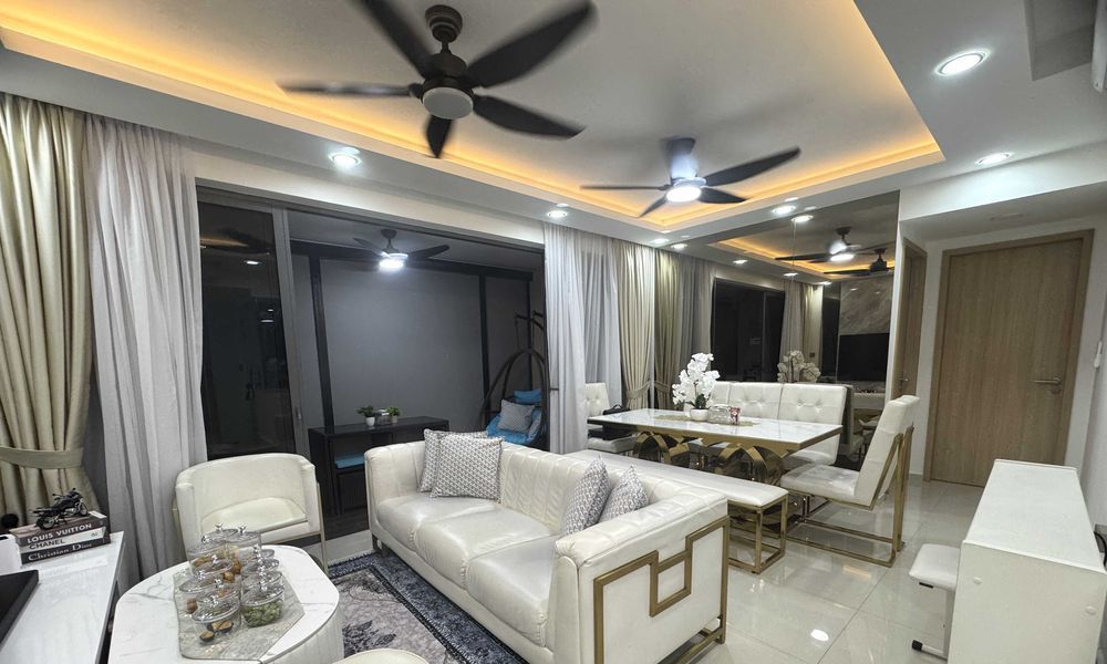 This well-maintained 3-bedroom unit boasts a thoughtful layout, featuring a galley kitchen with white stone countertops and built-in oven, complemented by wood-look cabinetry. The luxurious bathroom showcases a glass shower enclosure and stylish grey textured wall tiles, while the balcony offers a perfect spot for relaxation with its wicker seating area and soothing water feature views.