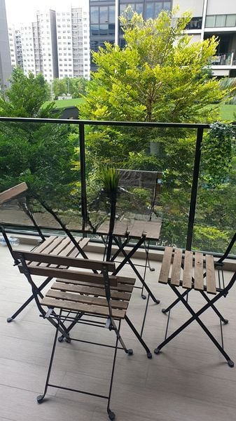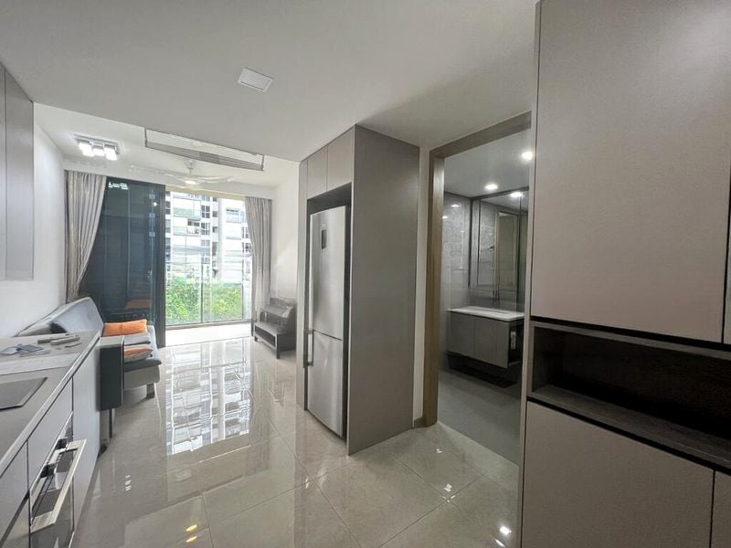 This efficient Type C1 layout boasts a seamless flow between the living and dining areas, perfect for entertaining. The galley kitchen is a chef's dream, equipped with a gas hob, built-in oven, and sleek white cabinetry. The master bedroom features large windows that frame the tranquil greenery, while the en-suite bathroom showcases a luxurious rain shower and modern finishes. Additional highlights include built-in wardrobes and a separate yard for added convenience.