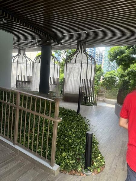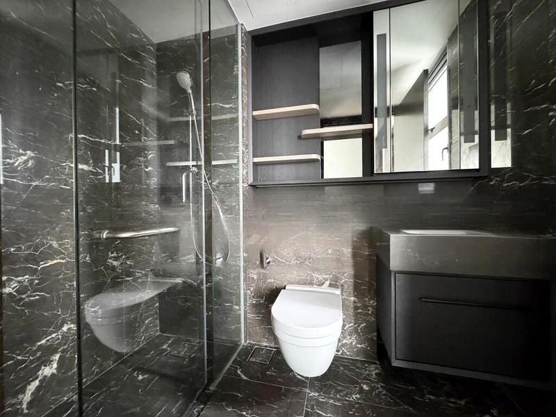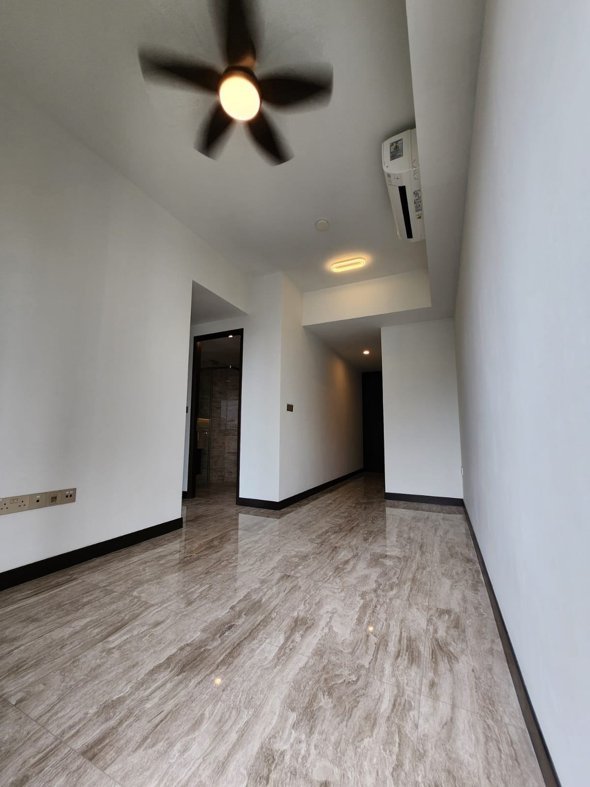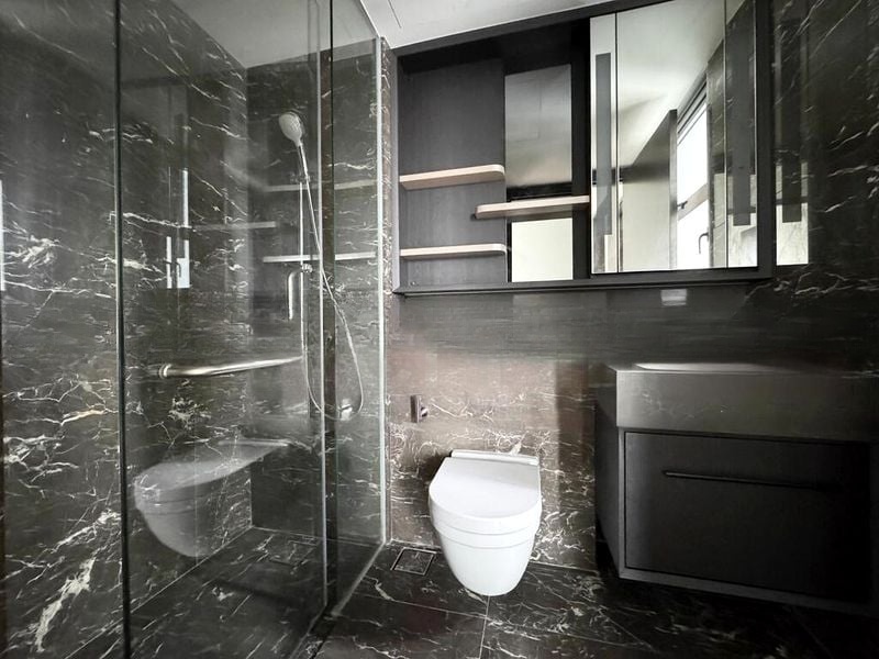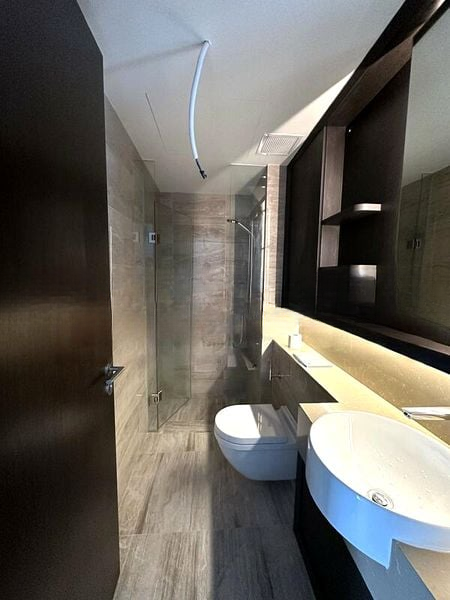 Step into a world of modern luxury as you enter this brand-new dual key condominium at NEU AT NOVENA. The open-concept living area greets you with large format floor tiles and a plush area rug, while designer pendant lighting casts a warm glow across the space. The mirrored wall panels add depth and elegance, creating an ambiance that is both inviting and sophisticated.