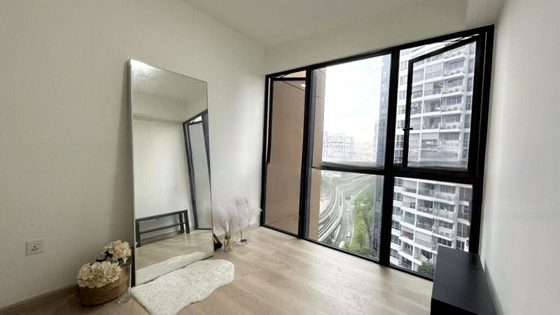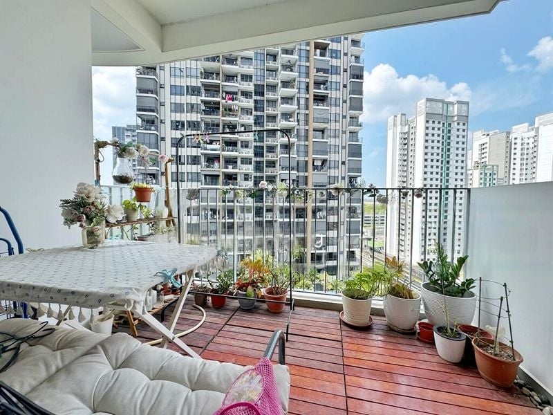 Step into a bright and airy sanctuary at High Park Residences, where abundant natural light floods the space, accentuating the modern finishes and inviting ambiance. The wooden balcony decking offers a perfect outdoor seating area, allowing you to soak in stunning urban views while surrounded by greenery.