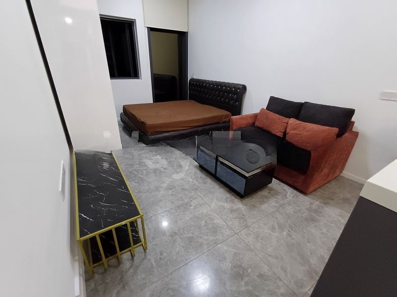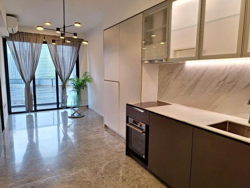 Step into this brand-new condominium at THE M and be greeted by abundant natural light pouring through floor-to-ceiling windows, illuminating the elegant marble-look porcelain tiles in the living room. The modern minimalist ambiance is complemented by stunning views of the city skyline and the inviting swimming pool, creating a serene yet vibrant living space.