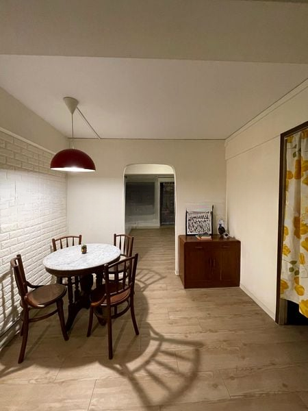 This well-maintained 1-bedroom unit features an efficient layout with a separate utility room, ideal for versatile use. The dining area boasts a round marble-top table under a striking red pendant light, set against a chic white brick feature wall. The galley kitchen is a chef's delight, equipped with minimalist white cabinetry and stainless steel appliances, ensuring functionality meets style.