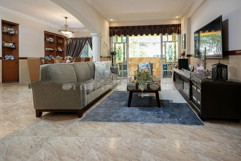 Step into a warm and inviting atmosphere where natural light dances across marble-look floor tiles, enhancing the cozy ambiance of this beautifully renovated HDB flat. The lush greenery view from the living area creates a serene backdrop, complemented by a large wall mirror that adds depth and elegance to the space.