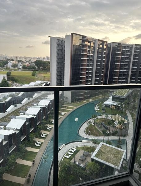 Step into a world of modern elegance with this brand-new 1-bedroom unit at Affinity at Serangoon. Bathed in abundant natural light, the minimalist design creates an inviting ambiance, while the high-floor perspective offers breathtaking views of the winding lap pool, landscaped gardens, and the city skyline. The architectural facade is complemented by night lighting in the common areas, enhancing the overall allure.