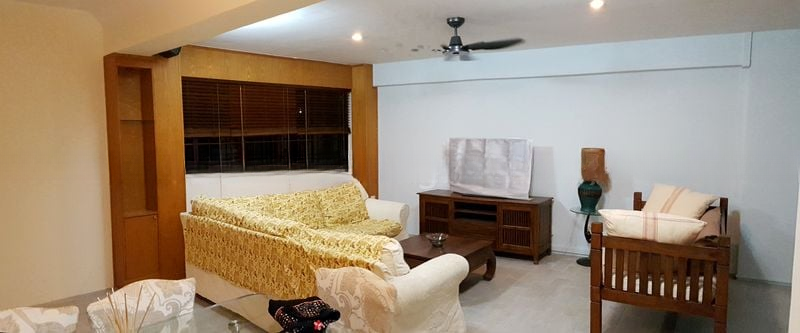 Step into a warm and inviting space where traditional wooden furniture and a homely ambiance greet you. The living room, adorned with a classic Chinese-style wooden sofa and extensive storage shelving, is bathed in moderate natural light, creating a cozy atmosphere perfect for relaxation. The tiled flooring throughout adds a touch of practicality, while ceiling fans and portable air conditioning ensure comfort year-round.