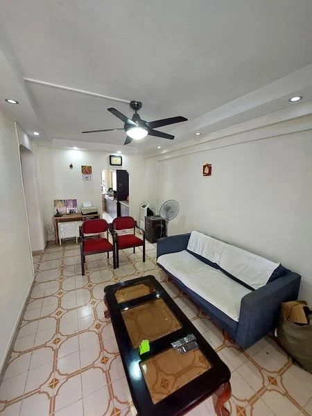 Step into this functional 2-bedroom flat and feel the lived-in charm that resonates throughout. The moderate natural light filters through the living room, highlighting the patterned ceramic floor tiles and the cozy blue fabric sofa. With a ceiling fan and recessed lighting, the ambiance is both inviting and practical, while views of neighboring residential blocks provide a sense of community.