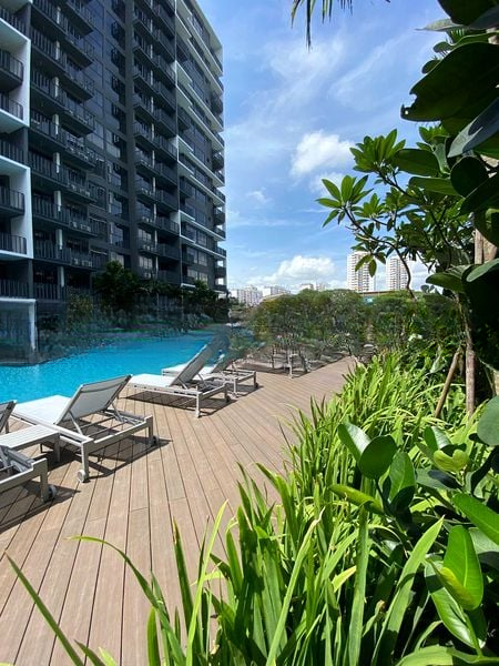 This well-designed 2-bedroom unit features large floor-to-ceiling windows in the bedroom, allowing for stunning views while you unwind. The integrated study area is perfect for remote work, with ample natural light to keep you energized. Enjoy outdoor dining on your private balcony, overlooking the expansive swimming pool and verdant greenery, perfect for relaxation and entertaining.