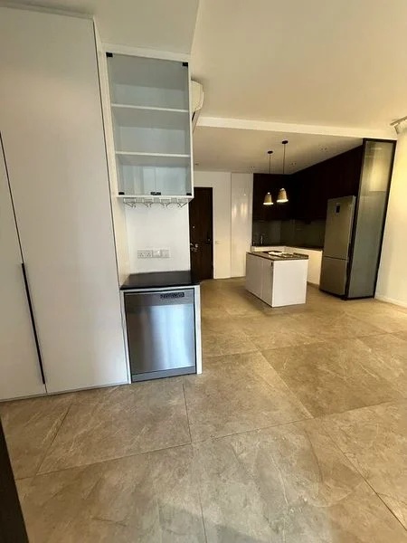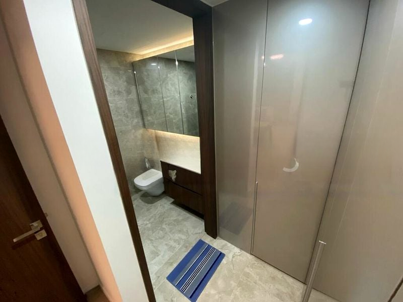 The heart of the home is the impressive island kitchen, complete with two-tone cabinetry and a built-in oven, perfect for culinary enthusiasts. Each of the three bedrooms boasts wood flooring and floor-to-ceiling windows, ensuring comfort and tranquility. The bathrooms are a luxurious retreat, featuring marble-look tiles, rain showers, and wall-hung toilets, designed for both style and functionality.