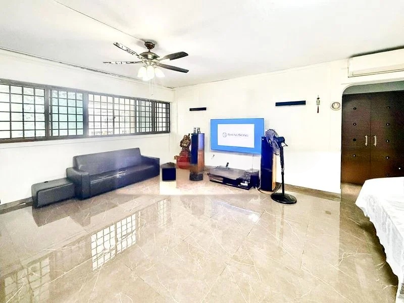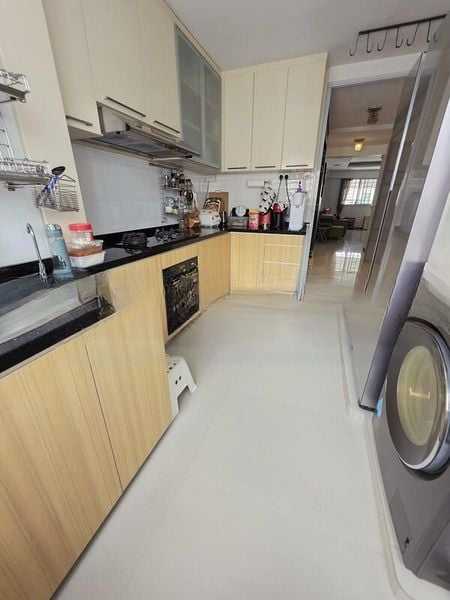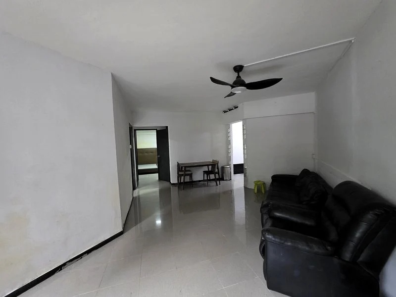 Step into this functional HDB flat and be greeted by a spacious living and dining area, where natural light filters through large windows, offering an urban view of neighboring blocks. The marble-patterned floor tiles add a touch of elegance, while the tiled walls in the living area and kitchen create a clean, modern ambiance.