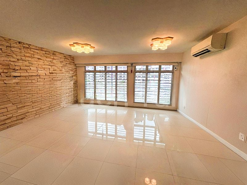 Step into a bright and airy sanctuary at 226C Sumang Lane, where abundant natural light floods the spacious living area, accentuating the stunning stone-textured feature wall and large windows that frame serene views of greenery and residential blocks. The ambiance is inviting, creating a perfect backdrop for both relaxation and entertaining.