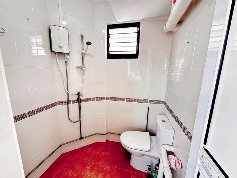 This unit boasts a functional layout with standout features including a fully-furnished living area, an L-shaped kitchen equipped with a built-in gas hob, and an indoor laundry drying rack for added convenience. The tiled flooring throughout adds a touch of elegance while ensuring easy maintenance. The bathroom is designed with white wall tiles and a pedestal sink, complemented by a louvered window for ventilation.