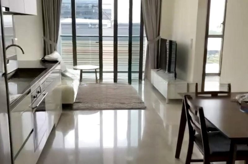 This well-maintained 2-bedroom unit features a stylish kitchen with dual-tone cabinetry, black countertops, and built-in appliances, including an integrated refrigerator and oven. The spacious living area flows seamlessly into the bedrooms, which boast dark wood laminate flooring and built-in sliding wardrobes. The bathrooms are designed for comfort, featuring a rain shower, wall-hung toilet, and a large mirrored cabinet that adds a touch of elegance.