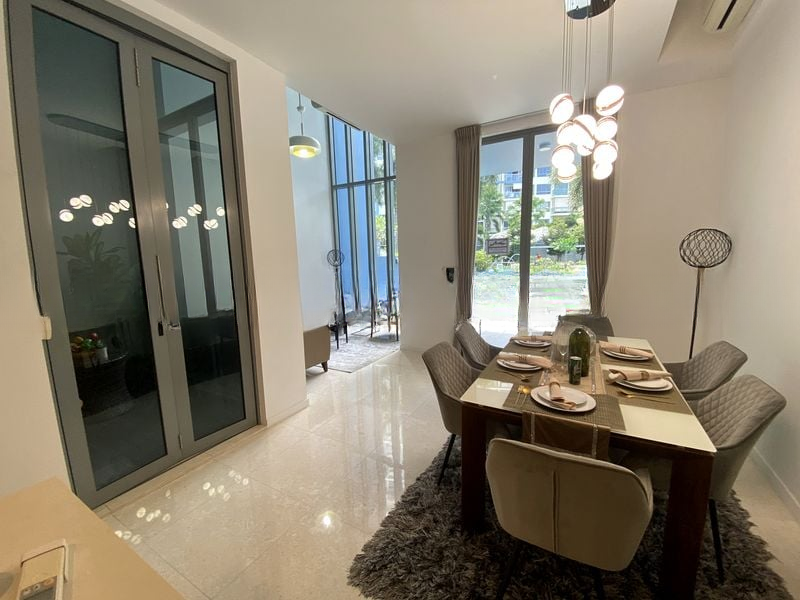 This spacious 3-bedroom, 4-bathroom unit boasts standout features including a galley kitchen with sleek white countertops and track lighting, a dining area adorned with a stunning modern chandelier, and a master suite with a wood-paneled feature wall. The bathrooms are a sanctuary of relaxation, featuring dark marble tiles and luxurious rain showers. With a large swimming pool and landscaped gardens just outside your door, every aspect of this property speaks to a lifestyle of comfort and sophistication.