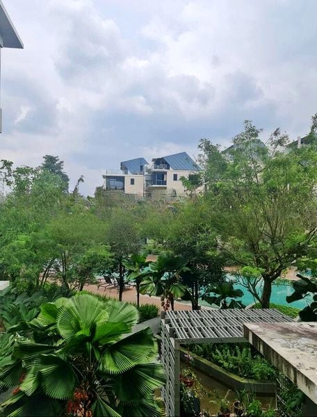 Step into a bright and airy sanctuary at The Miltonia Residences, where abundant natural light floods the space, accentuating the polished tile flooring and elegant finishes. The inviting living room seamlessly connects to a private balcony, offering serene views of the pool and lush greenery, creating a perfect backdrop for relaxation.