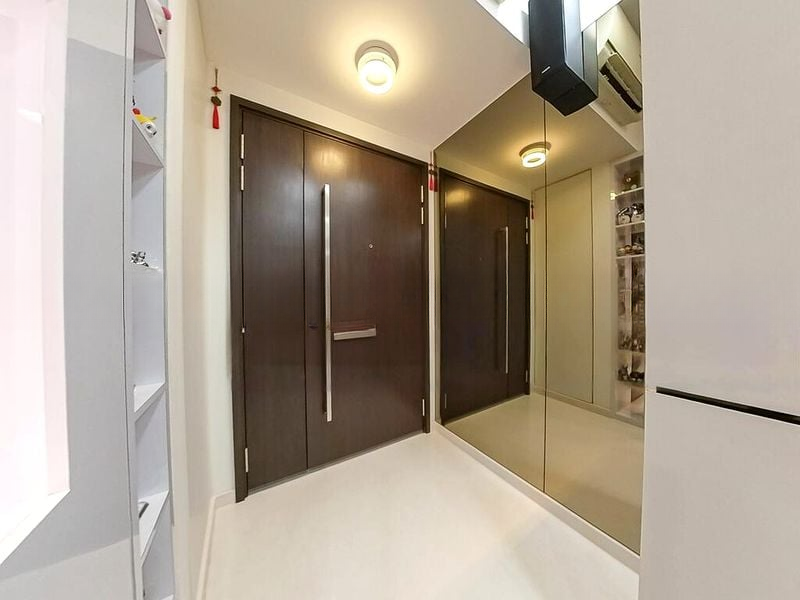 Step into a world of modern elegance as you enter this beautifully renovated unit at The Inflora. The foyer greets you with a striking full-height mirrored wall, enhancing the sense of space and light. The curved false ceiling adorned with cove lighting creates a warm ambiance, while the white tiled flooring adds a touch of sophistication. Natural light filters through the enclosed balcony, perfect for relaxation or entertaining.