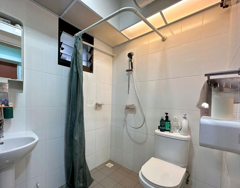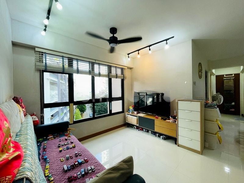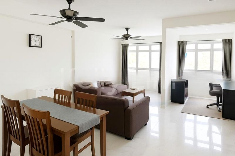 Step into a bright and airy sanctuary at 22 Ghim Moh Link, where abundant natural light floods the open-concept living and dining area, accentuated by sleek white tiled flooring and large windows draped in soft grey curtains. The ambiance is inviting, with views of lush greenery and neighboring blocks that create a serene backdrop for your daily life.