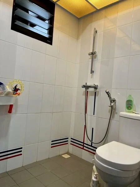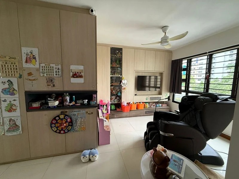 This well-maintained 5-room flat features a seamless layout, showcasing a stylish dining area with built-in light wood-grain cabinetry and glass display shelving. The dedicated study nook, integrated into the living space, offers a perfect work-from-home setup, while the bedroom boasts a striking purple accent wall and a cozy daybed, ensuring comfort and style. Additional highlights include a household shelter for extra storage and a separate service yard for added convenience.