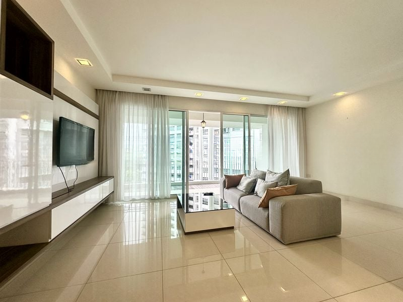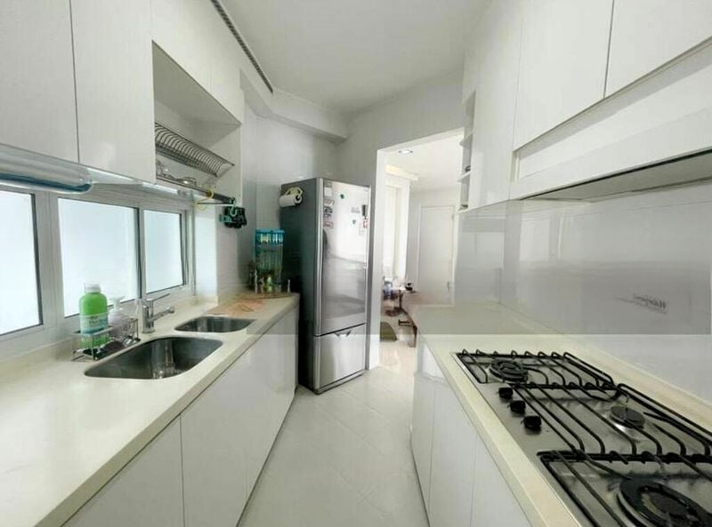 Step into a well-maintained 3-bedroom flat that exudes a clean and functional ambiance. The natural light filters through the spacious living area, highlighting the stone-look floor tiles and the elegant track lighting that sets a warm tone for gatherings. The glass partition wall between the kitchen and dining area adds a contemporary touch, making the space feel open and inviting.