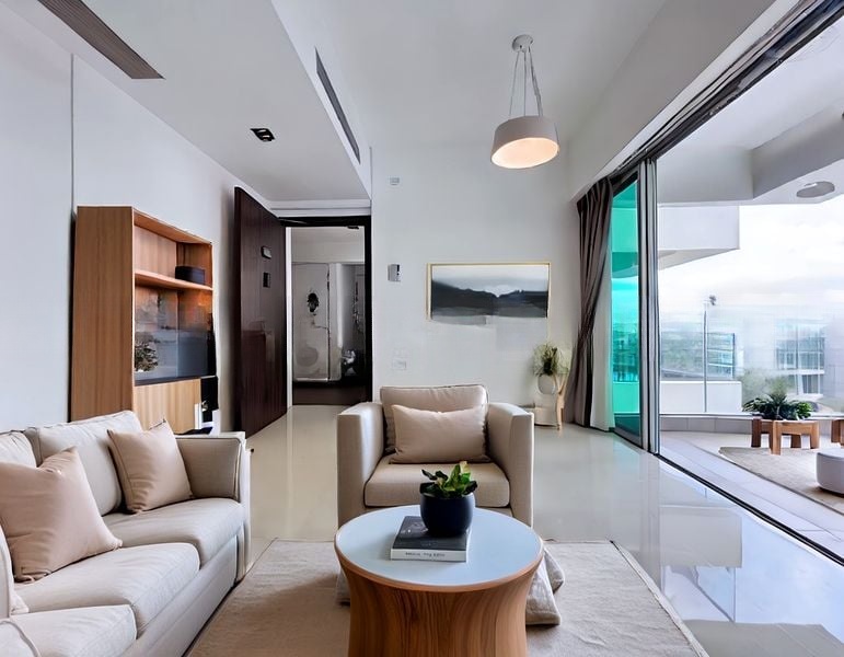 Step into a sanctuary of light and space at Nathan Residences, where abundant natural light floods the open-concept living area through floor-to-ceiling sliding doors. The neutral colour palette and pendant lighting create a bright and airy ambiance, while the urban views and greenery from the large balcony invite you to unwind in style.