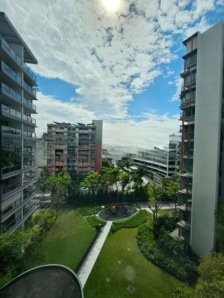 Step into this beautifully maintained unit at Double Bay Residences, where abundant natural light floods the open-concept living and dining area through large floor-to-ceiling windows. The airy ambiance is complemented by dual ceiling fans, creating a refreshing space that invites relaxation. Enjoy picturesque views of lush greenery, the city skyline, and a nearby playground from your spacious balcony, featuring elegant wooden decking.