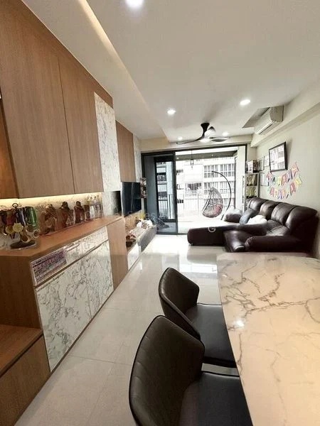 Step into a world of modern elegance as you enter this beautifully renovated 3-bedroom unit at Rivercove Residences. Bathed in abundant natural light, the open-concept living area features a cozy L-shaped leather sofa and a designer TV console with marble accents, creating an inviting ambiance. The balcony, complete with a hanging egg chair, offers unblocked views of lush greenery and serene water, perfect for unwinding after a long day.
