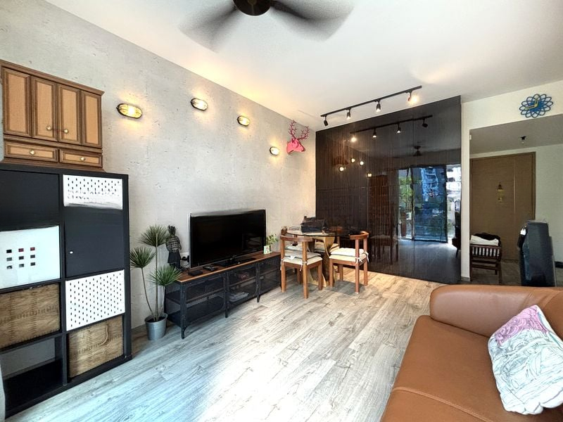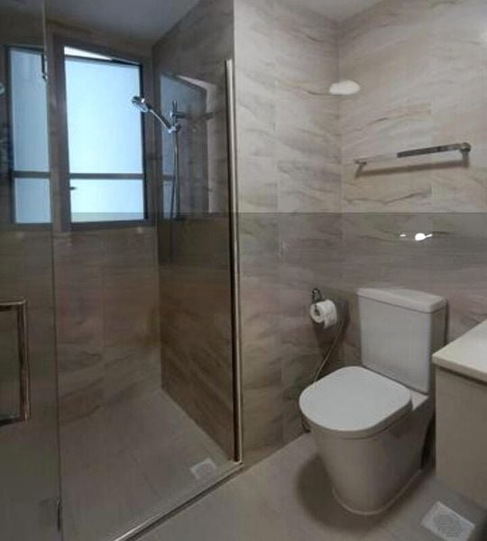 This well-maintained unit features three spacious bedrooms, each designed for comfort and functionality. The master bedroom boasts a built-in floor-to-ceiling wardrobe and en-suite bathroom access, while the common bedroom includes a custom platform bed with integrated study desk. Elegant marble-look wall tiles and track lighting elevate the bathrooms, ensuring a stylish yet practical environment.