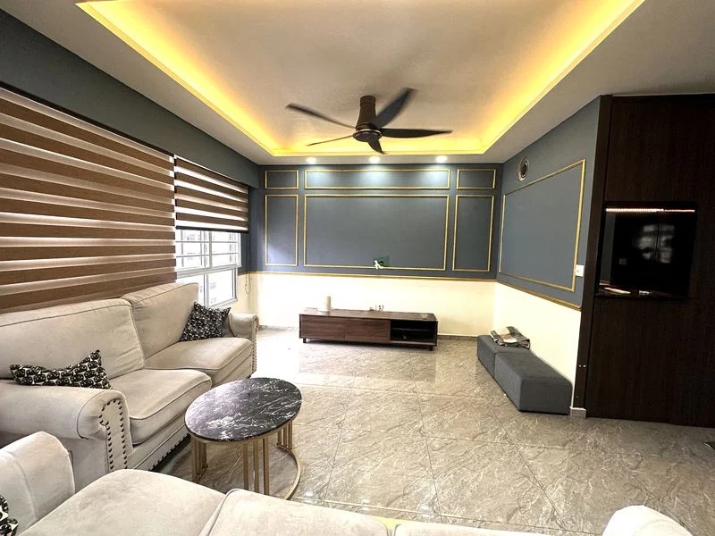 Step into a beautifully renovated 4-room flat that exudes modern charm and warmth. The inviting living room features a striking brick-textured feature wall, complemented by track lighting that enhances the space's ambiance. Natural light filters through the large windows, creating a bright and airy atmosphere perfect for family gatherings.