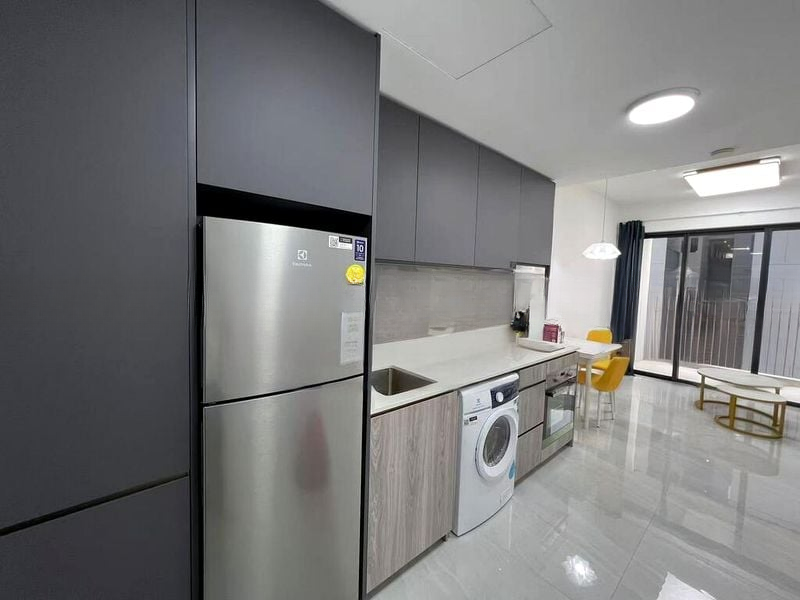 This thoughtfully designed 2-bedroom unit features a fully-furnished layout with standout elements such as an integrated washing machine and a rain shower in the bathroom. The kitchen boasts white stone countertops, two-tone cabinetry, and integrated appliances, making it a chef's delight. Enjoy meals in the dining area illuminated by modern pendant lighting, while the compact workspace on the balcony offers a perfect nook for productivity.
