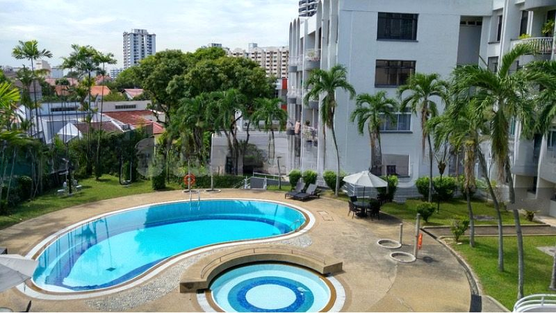 Step into a bright and airy sanctuary at Charming Garden, where abundant natural light floods the spacious living area through large glass sliding doors. The polished wood flooring and distinctive arched architecture create an inviting ambiance, while the expansive balcony offers unobstructed views of the kidney-shaped swimming pool and lush greenery, perfect for relaxation.