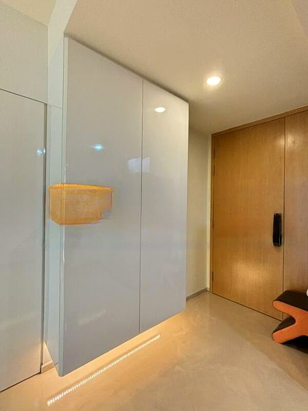 Step into a world of modern luxury as you enter this brand-new unit at Blossom Residences. The designer renovation showcases stunning finishes, from the gleaming white high-gloss cabinets with gold trims in the kitchen to the elegant marble-look island that invites culinary creativity. Natural light filters through the space, enhancing the ambiance, while the thoughtful design elements, such as the airplane-shaped ceiling light and under-cabinet LED lighting, create a warm and inviting atmosphere.