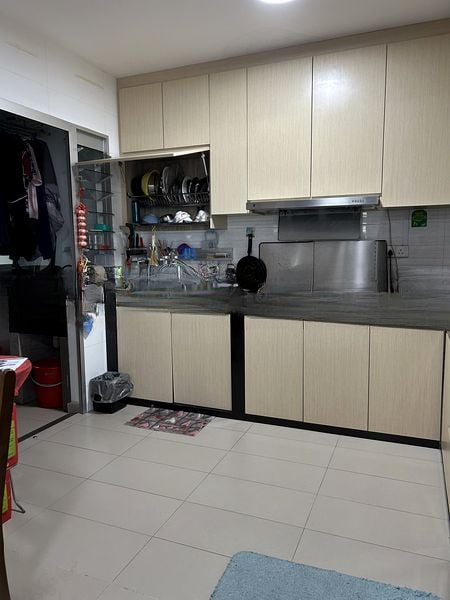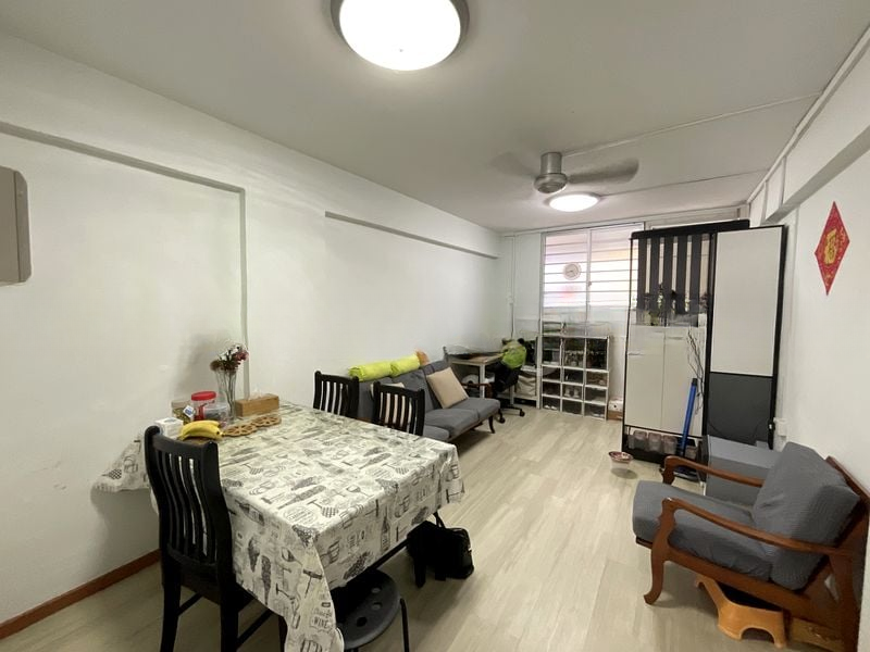 Step into this well-maintained 3-bedroom HDB flat and be greeted by the inviting ambiance created by large windows that fill the space with natural light. The marble-look floor tiles add a touch of elegance, while the ceiling fans in every room ensure a comfortable living environment. Enjoy the urban views of the surrounding HDB blocks from the living room, enhanced by the soft blue curtains that complement the decor.