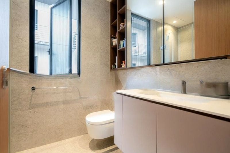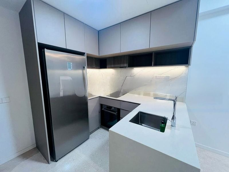 This well-maintained 2-bedroom, 1-bathroom layout features standout elements such as a fully equipped kitchen with integrated appliances and a built-in wine chiller, complemented by marble-look countertops and modern cabinetry. The master bedroom and study area boast custom full-height cabinetry and warm wood flooring, while the jack-and-jill bathroom offers convenience and style. Step out onto the spacious balcony to enjoy the tranquil surroundings.