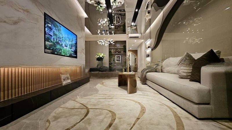 Step into a world of modern elegance as you enter this beautifully designed unit at Verdale. The abundant natural light floods the open-concept living area, highlighting the polished tile flooring and the stunning views of the lap pool and lush greenery. With a minimalist ambiance, the space is accentuated by custom floating shelves with integrated LED lighting and a wall-mounted marble-look TV console, creating a serene and inviting atmosphere.