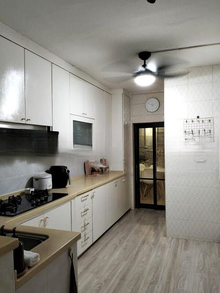 This well-maintained 3-bedroom flat features a galley kitchen with stylish two-tone cabinets, complemented by a chic green glass backsplash. The dining area, equipped with a 6-seater dining set, is ideal for family gatherings or entertaining friends. With a total floor area of 990 sqft, the layout maximizes space while ensuring comfort and functionality throughout.