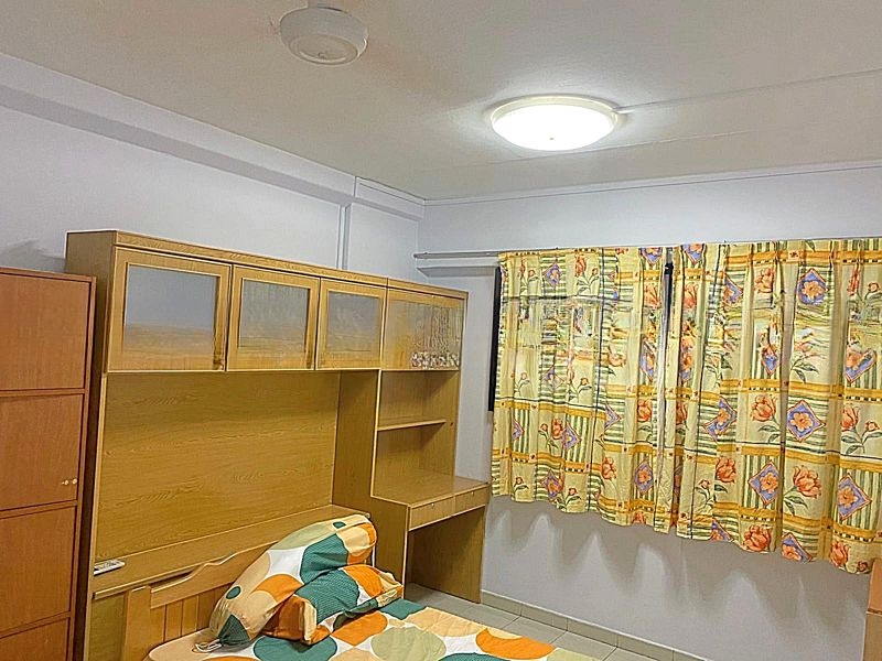 Step into a warm and inviting atmosphere where vibrant green accent walls and a large wall mirror create a sense of spaciousness and comfort. The living room, adorned with tiled flooring and a ceiling fan, is bathed in natural light from the large window, offering views of the lush greenery and neighboring HDB blocks. This cozy unit is perfect for unwinding after a long day, enhanced by the thoughtful furnishings, including a massage chair for ultimate relaxation.